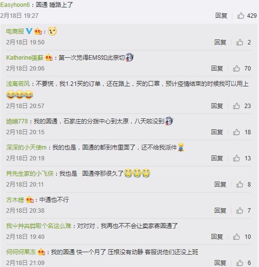 網友“滿杯甜酒椰”發布微博稱,“我十天沒動的韻達是不是可以更新一下物流惹”;網友“啵霸兔兔果茶”說,“圓通快遞怕是消失了,送個東西幾天不動一下”;網友“啊啊啊喵在等待”則調侃,“等中通快遞把我的口罩寄到了,疫情也快結束了吧”。