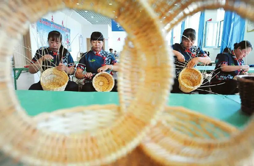 資料圖。廣靈縣農民編織技工正在編織柳條插花籃 來源:山西日報