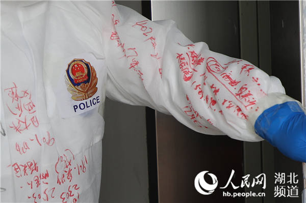 穿著這件“絕版防護服”的,正是湖北荊州市公安局沙市區(qū)分局勝利街派出所所長代睿。“護目鏡起霧視線模糊,又怕漏掉居民的需求,只好寫在防護服上。我的手臂上寫的都是急需的藥品等物資,胸前和腿上寫的是急需的生活用品。”代睿說,這樣記錄方便也能看的清。