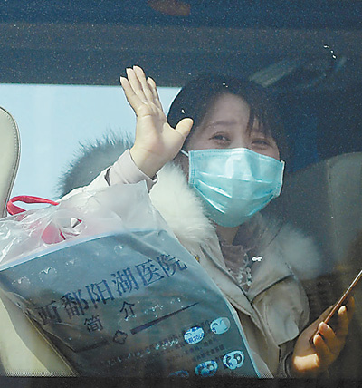 2月22日,江西中醫(yī)藥大學(xué)附屬醫(yī)院撫生院區(qū),11名此前由其他醫(yī)療機構(gòu)轉(zhuǎn)入該院的新冠肺炎患者治愈出院,其中有8人在該院接受了中醫(yī)治療,3人接受中西醫(yī)結(jié)合治療。圖為出院的病人向醫(yī)護(hù)人員揮手告別。時 雨攝(影像中國)
