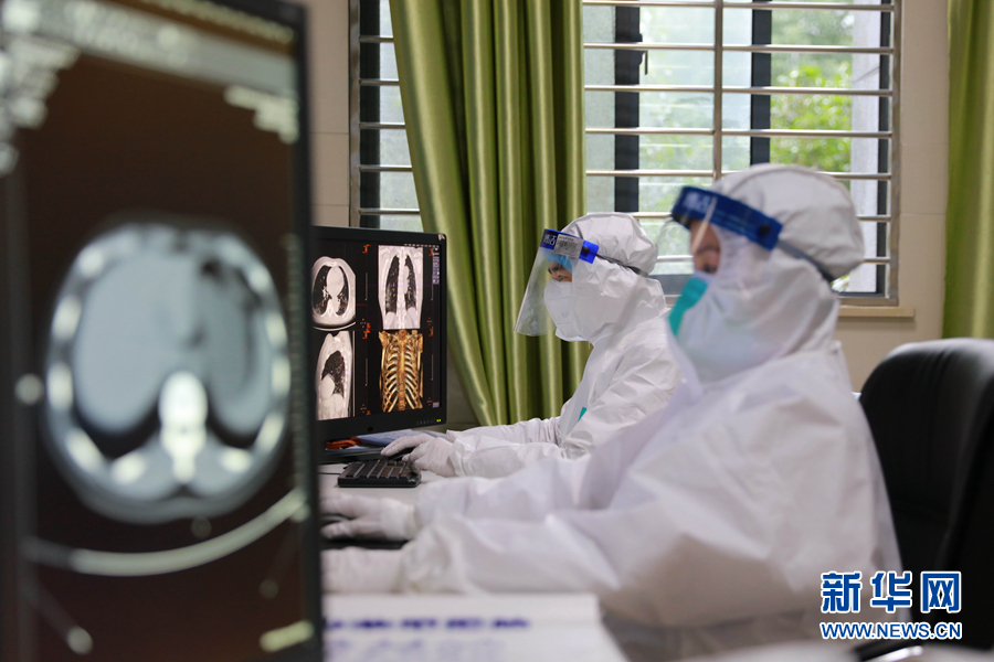 2月26日,湖北省榮軍醫院放射科主任龔文松(左)、肖顏查看病人CT結果。 新華社發(朱玲玲 攝)