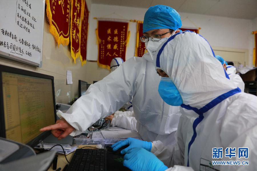 2月1日,在湖北省榮軍醫院發熱門診,醫生王琴(右一)和護士劉蕭(左二)接診發熱患者。 新華社發(劉中燦 攝)