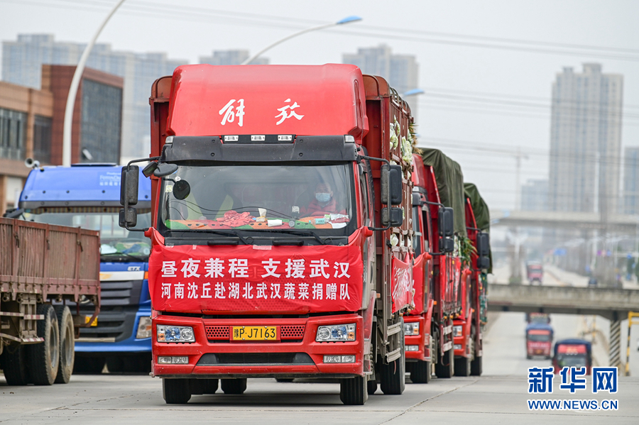 3月1日,河南沈丘退伍老兵王國輝帶隊第三次來到武漢送菜,將沈丘縣委縣政府采購的130噸農副產品捐贈給武漢。 新華社發(侯建勛 攝)