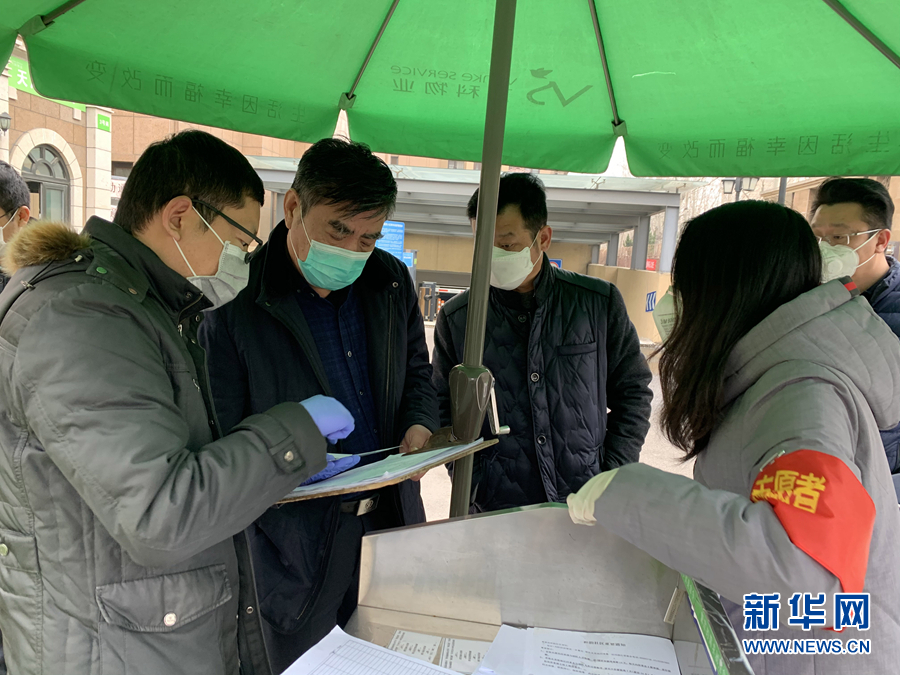2月20日,天津市濱海新區政協副主席、應急管理局黨組書記、局長、退役軍人單玉厚(左二)生前在疫情防控一線工作。 新華社發