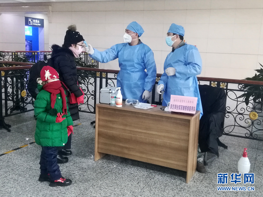 2月14日,黑龍江哈爾濱68名自主擇業軍轉干部組成的“橄欖綠疫情防控志愿服務隊”隊員在火車站為旅客測量體溫。 新華社發(韓振忠 攝)