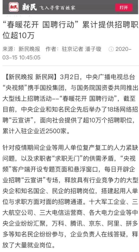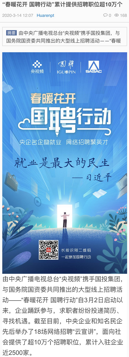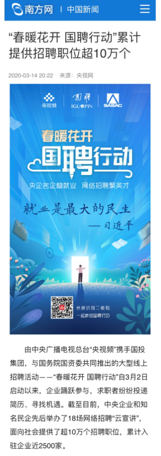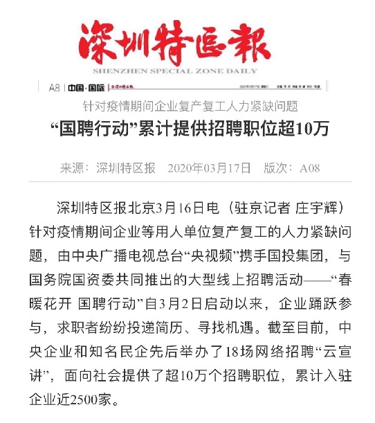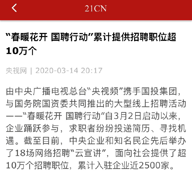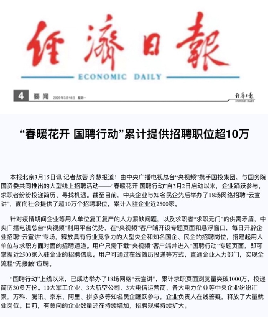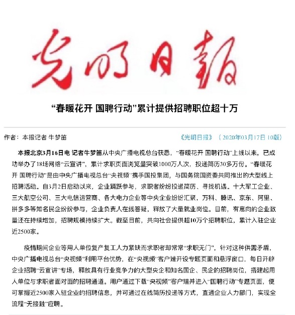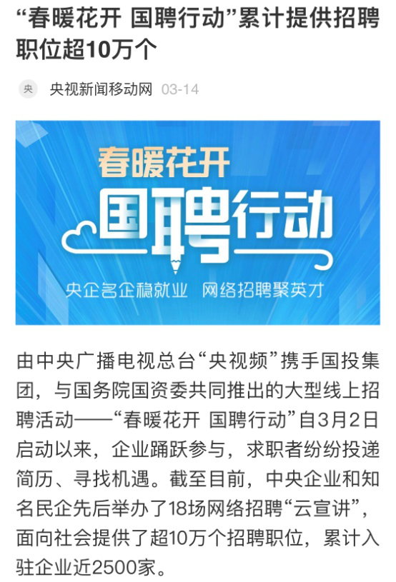 由中央廣播電視總臺“央視頻”攜手國投集團,與國務院國資委共同推出的大型線上招聘活動——“春暖花開 國聘行動”,自3月2日啟動以來,企業踴躍參與,求職者紛紛投遞簡歷。截至3月14日已面向社會提供了超10萬個招聘職位,累計入駐企業近2500家,引發眾多媒體和網站轉載報道。