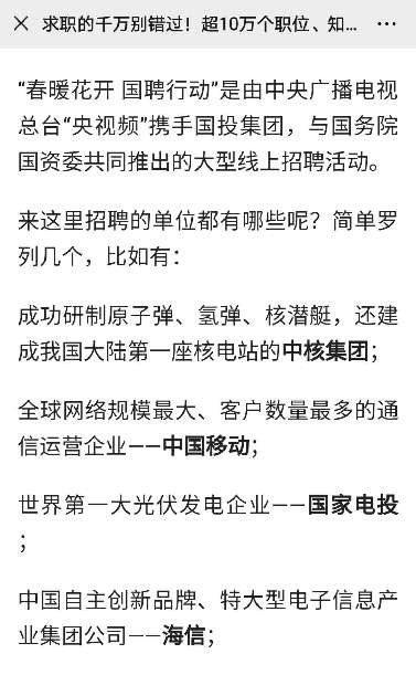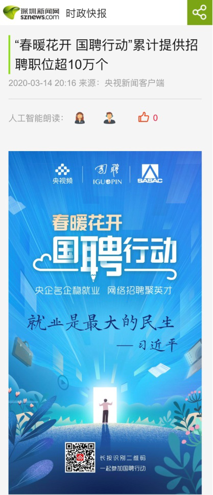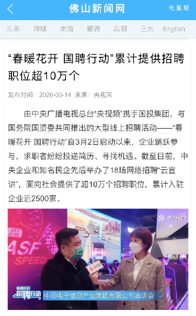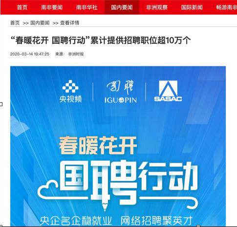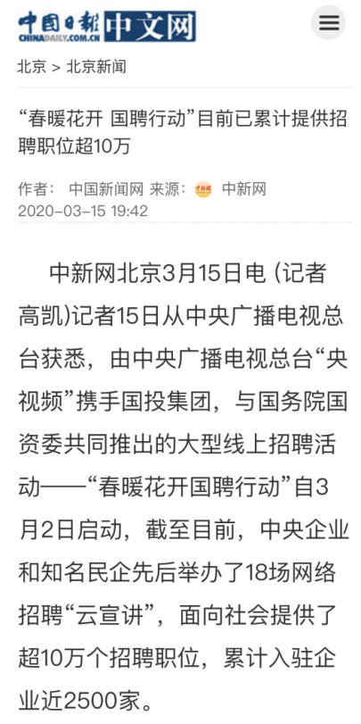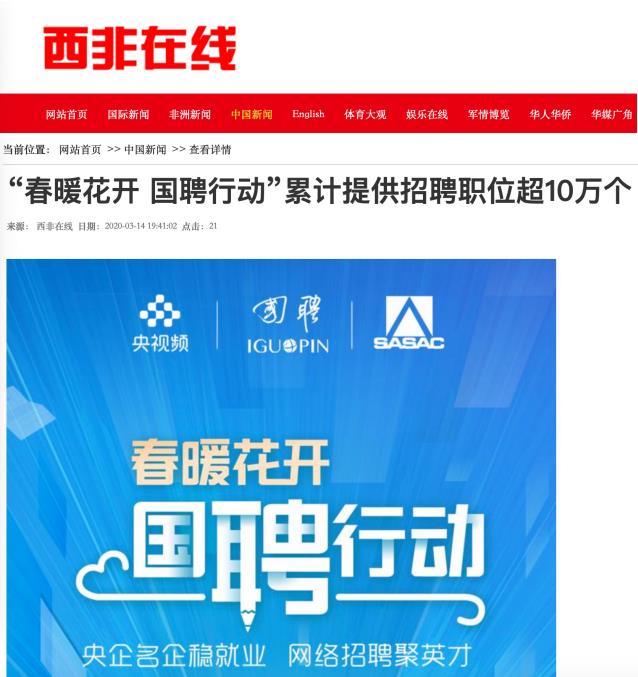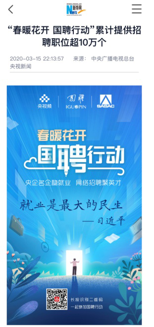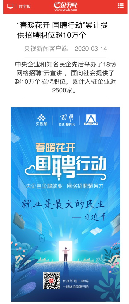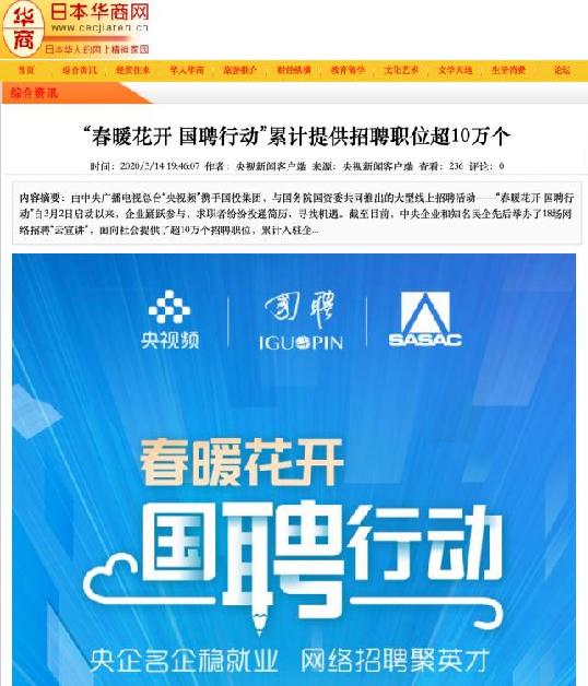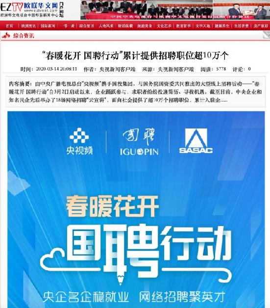 由中央廣播電視總臺“央視頻”攜手國投集團,與國務院國資委共同推出的大型線上招聘活動——“春暖花開 國聘行動”,自3月2日啟動以來,企業踴躍參與,求職者紛紛投遞簡歷。截至3月14日已面向社會提供了超10萬個招聘職位,累計入駐企業近2500家,引發眾多媒體和網站轉載報道。