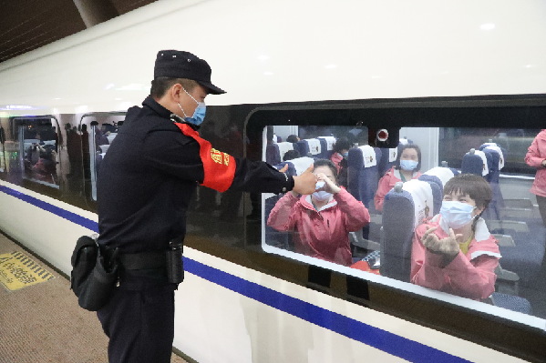 隨著疫情防控形勢逐步轉(zhuǎn)好,完成救助任務(wù)的各地馳援醫(yī)療隊(duì)將分批有序撤離。當(dāng)日,來自貴州、湖南、河南三省的484名援鄂醫(yī)護(hù)人員分8批次,分別乘坐5趟高鐵踏上回家的路程,在武漢火車站,鐵路民警、車站工作人員和志愿者們在進(jìn)站口、候車室、站臺(tái)上歡送這群最美麗的“白衣天使”。
