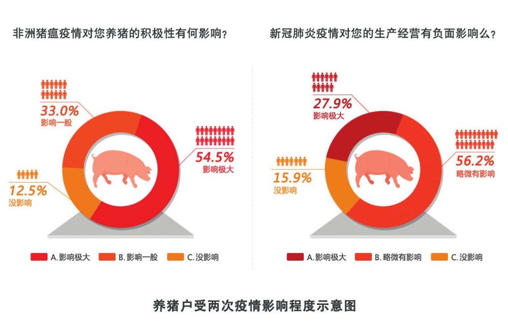 調查顯示,54.5%的養豬戶認為非洲豬瘟疫情對養豬的積極性影響極大,防護成本高、造成虧損、仔豬成本高,是養豬戶反映非洲豬瘟疫情帶來的最強烈影響,27.9%的養豬戶認為新冠肺炎疫情對生產經營的負面影響極大。(見圖1)