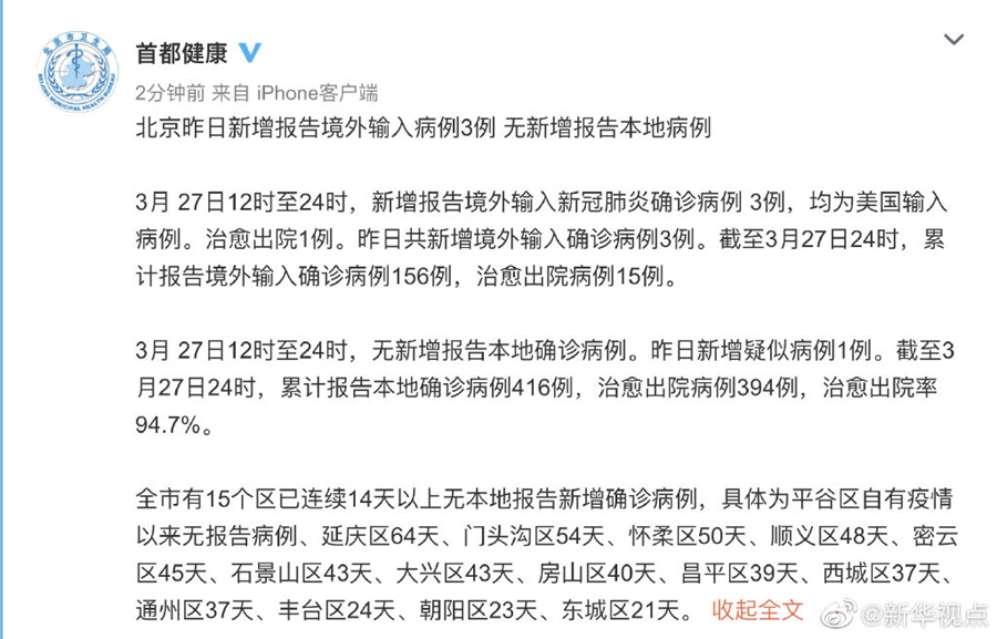 北京27日新增報告境外輸入病例3例 無新增報告本地病例-新華網