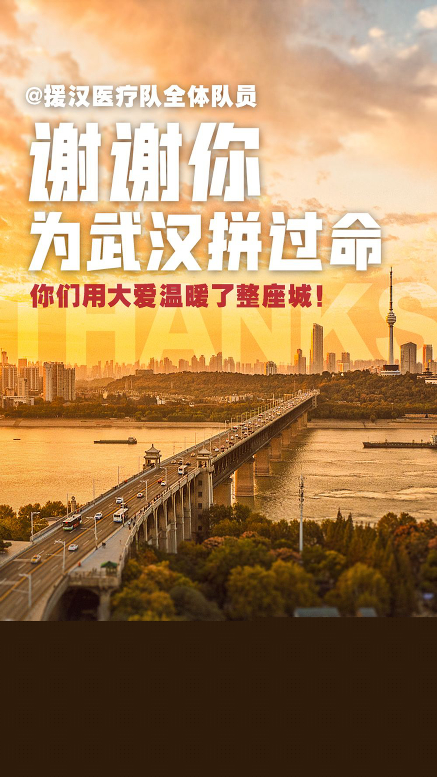 新冠肺炎疫情突如其來,武漢疫情牽動著全國人民的心,武漢成為疫情防控斗爭的重中之重和決勝之地。在以習近平同志為核心的黨中央堅強領導下,人民解放軍、全國各地鼎力相助、火線馳援。兩個多月來,你們毅然告別家人,白衣執甲、逆行出征,日夜奮戰在看不見硝煙的戰場上,同時間賽跑、與病魔較量,涌現出一大批可歌可泣的先進典型和感人事跡,為打贏武漢保衛戰發揮了中堅力量的作用,展現了醫者仁心的崇高精神,展現了新時代醫務工作者的良好形象,感動了武漢,感動了中國,感動了世界!在此,中共武漢市委、武漢市人民政府和一千多萬武漢市民,向你們致以最崇高的敬意和最誠摯的感謝!