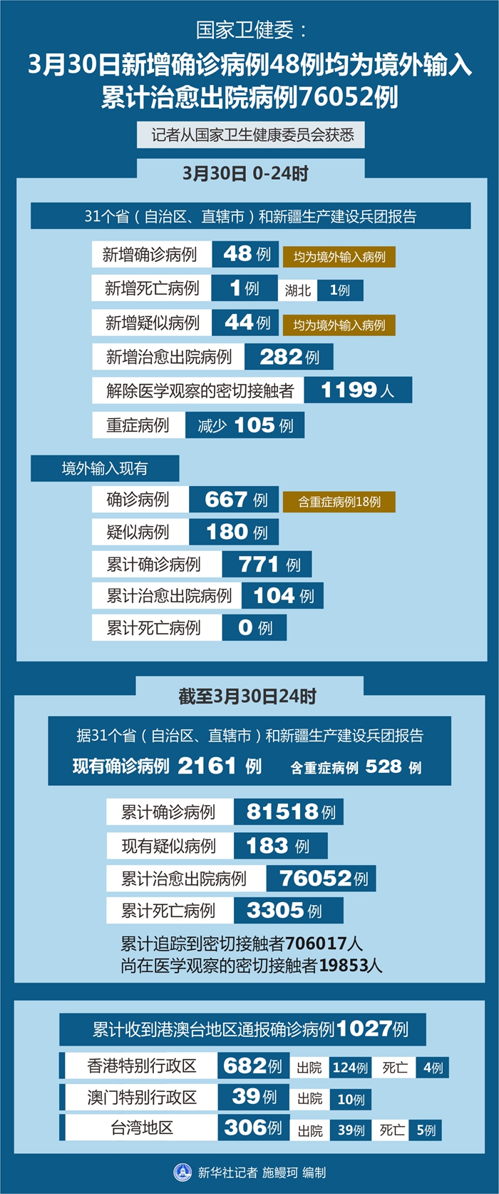 新華社北京3月31日電(記者劉羊旸、王秉陽)記者31日從國家衛生健康委員會了解到,3月30日0—24時,31個省(自治區、直轄市)和新疆生產建設兵團報告新增確診病例48例,均為境外輸入病例;新增死亡病例1例(湖北1例);新增疑似病例44例,均為境外輸入病例。