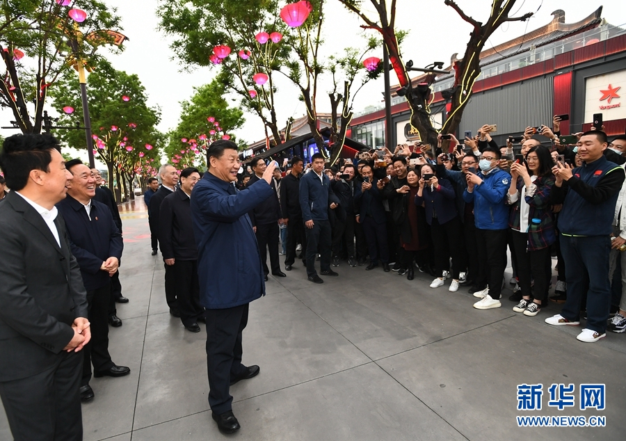 4月20日至23日,中共中央總書記、國家主席、中央軍委主席習近平在陜西考察。這是4月22日,習近平在西安大唐不夜城步行街考察時,向游客揮手致意。 新華社記者 謝環(huán)馳 攝