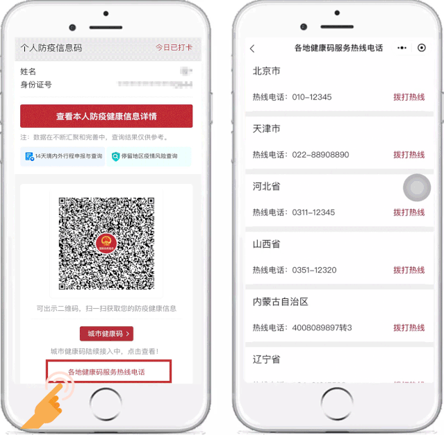 現在,在防疫信息碼的亮碼頁增加了“各地健康碼服務熱線電話”,用戶可通過服務熱線咨詢健康碼使用問題。