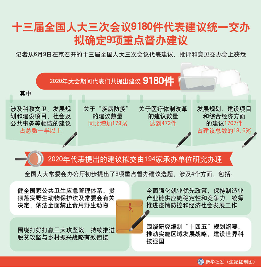 新華社北京6月9日電(記者羅沙)記者從9日在京召開的十三屆全國人大三次會議代表建議、批評和意見交辦會上獲悉,今年大會期間代表們共提出建議9180件。