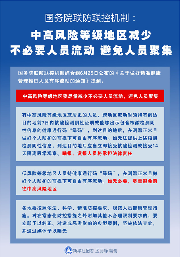 新華社北京6月25日電(記者王秉陽)國務院聯防聯控機制綜合組25日公布的《關于做好精準健康管理推進人員有序流動的通知》提到,中高風險等級地區要盡量減少不必要人員流動,避免人員聚集。
