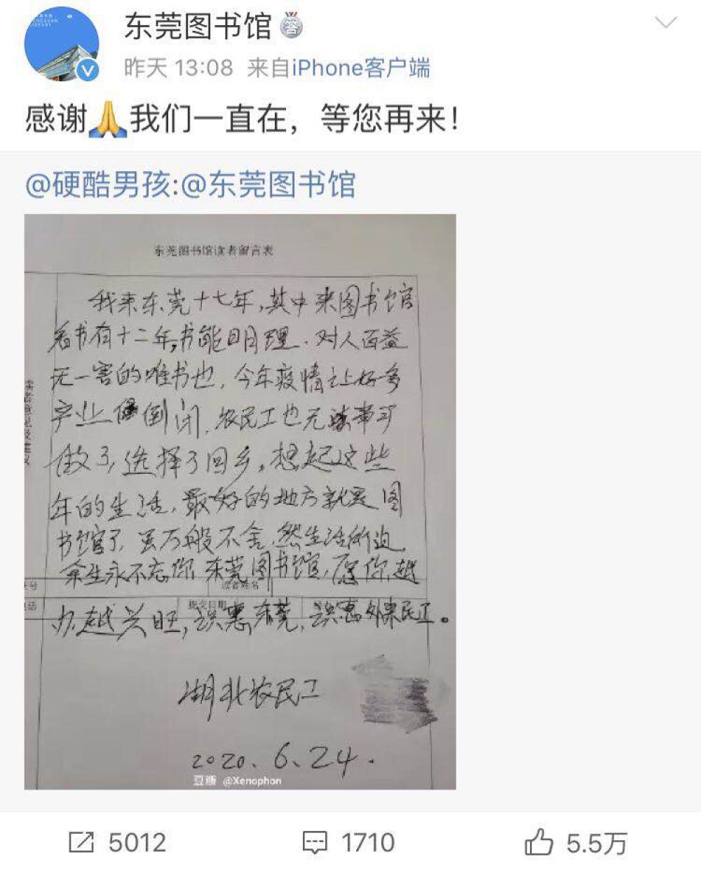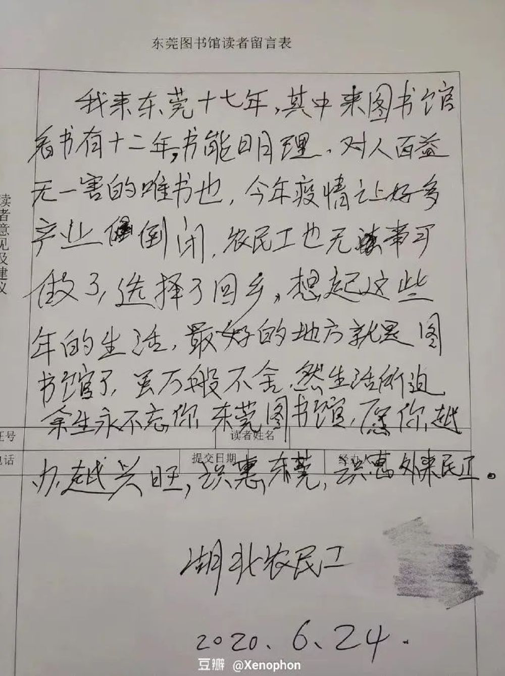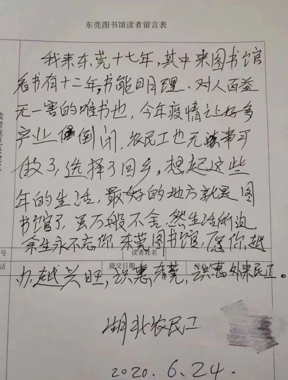 “我來東莞十七年,其中來圖書館看書有十二年。書能明理,對(duì)人百益無一害的唯書也。今年疫情讓好多產(chǎn)業(yè)(企業(yè))倒閉,農(nóng)民工也無事可做了,選擇了回鄉(xiāng)。想起這些年的生活,最好的地方就是圖書館了。雖萬般不舍,然生活所迫,余生永不忘你,東莞圖書館,愿你越辦越興旺。識(shí)惠東莞,識(shí)惠外來農(nóng)民工。”