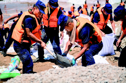 ▲7月23日,在浪拔湖鎮紅堰湖村,救援人員在裝填石袋。新華社記者陳思汗攝