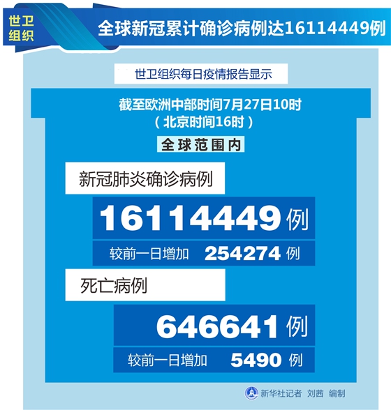世衛組織每日疫情報告顯示,截至歐洲中部時間27日10時(北京時間16時),全球確診病例較前一日增加254274例,達到16114449例;死亡病例增加5490例,達到646641例。