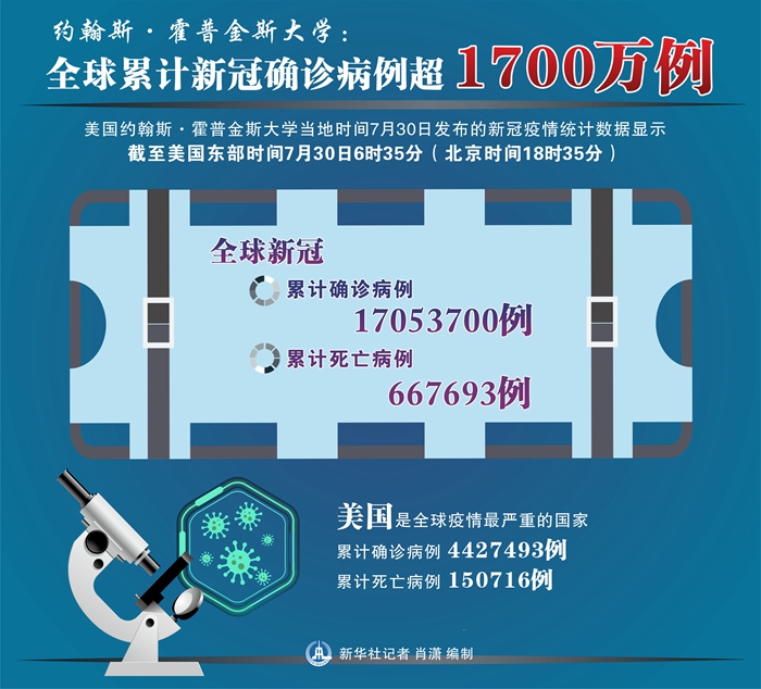 新華社紐約7月30日電 美國約翰斯·霍普金斯大學30日發布的新冠疫情統計數據顯示,截至美國東部時間30日6時35分(北京時間18時35分),全球累計確診病例達到17053700例,累計死亡667693例。