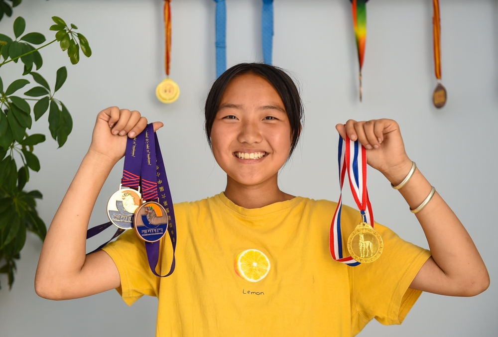 8月4日,錫林花在家中展示自己過去獲得的賽馬、射箭比賽獎(jiǎng)牌。