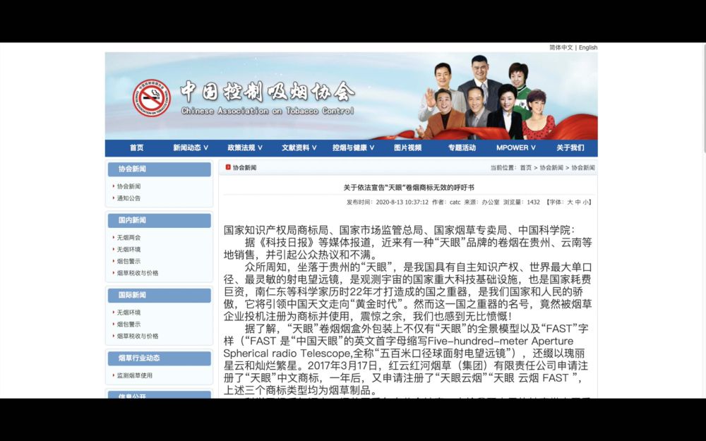 針對“天眼”被煙草企業注冊商標并使用一事,中國控制吸煙協會8月13日在其官網發布聲明,希望國家知識產權局商標局等部門對此事予以關注。