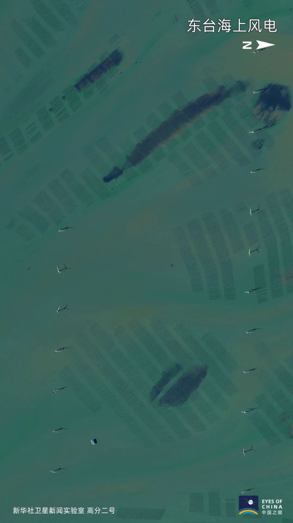 江蘇東臺,漁排間的海上風電機星星點點。2019年中國可再生能源發電總裝機容量達到7.94億千瓦,占全部電力裝機的39.5%。
