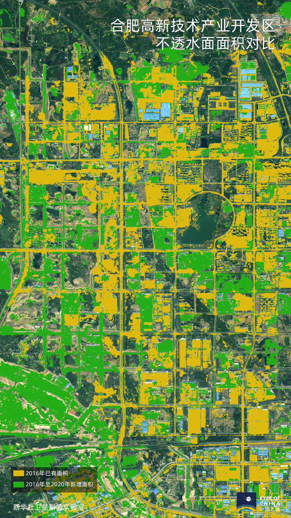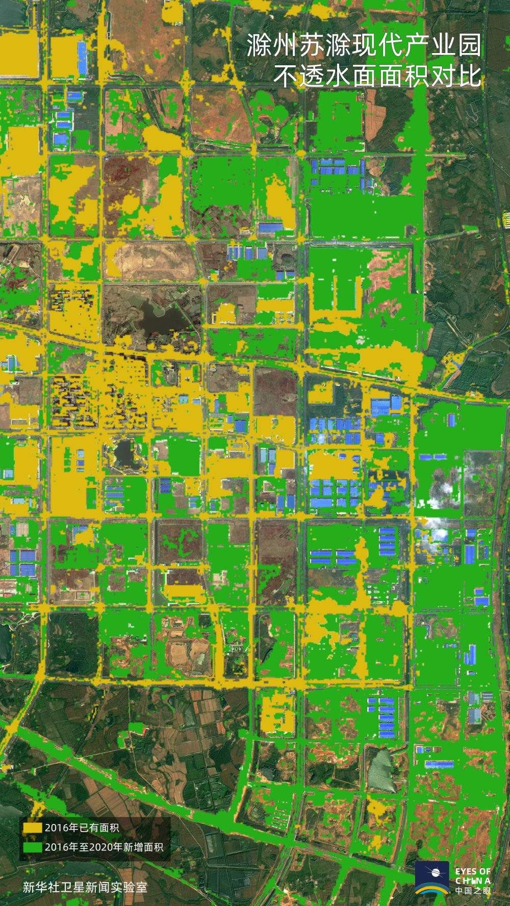 黃色覆蓋區域為2016年已有不透水面區域,綠色為2020年較2016年新增區域。大幅增加的綠色顯示,滁州和合肥的工業園區范圍在快速向外延伸,經濟發展邁上新臺階。