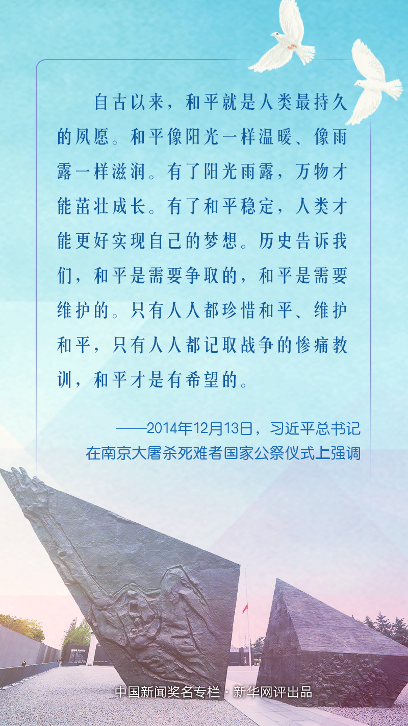 和平是人類的永恒期望。今天,和平與發展已經成為時代主題,但世界仍很不太平,戰爭的達摩克利斯之劍依然懸在人類頭上。歷史告訴我們,和平需要爭取,更需要維護。只有人人都珍惜和平、維護和平,只有人人都汲取戰爭的慘痛教訓,和平才會更有希望。我們要以史為鑒,堅定維護和平的決心,堅定不移走和平發展道路,才能推動建設持久和平、普遍安全、共同繁榮、開放包容、清潔美麗的新世界,讓和平的陽光永遠普照人類生活的星球。