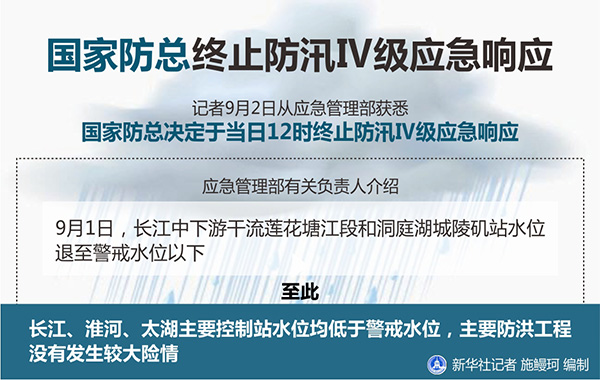 新華社北京9月2日電(記者劉夏村)記者2日從應(yīng)急管理部獲悉,國家防總決定于當(dāng)日12時(shí)終止防汛Ⅳ級(jí)應(yīng)急響應(yīng)。