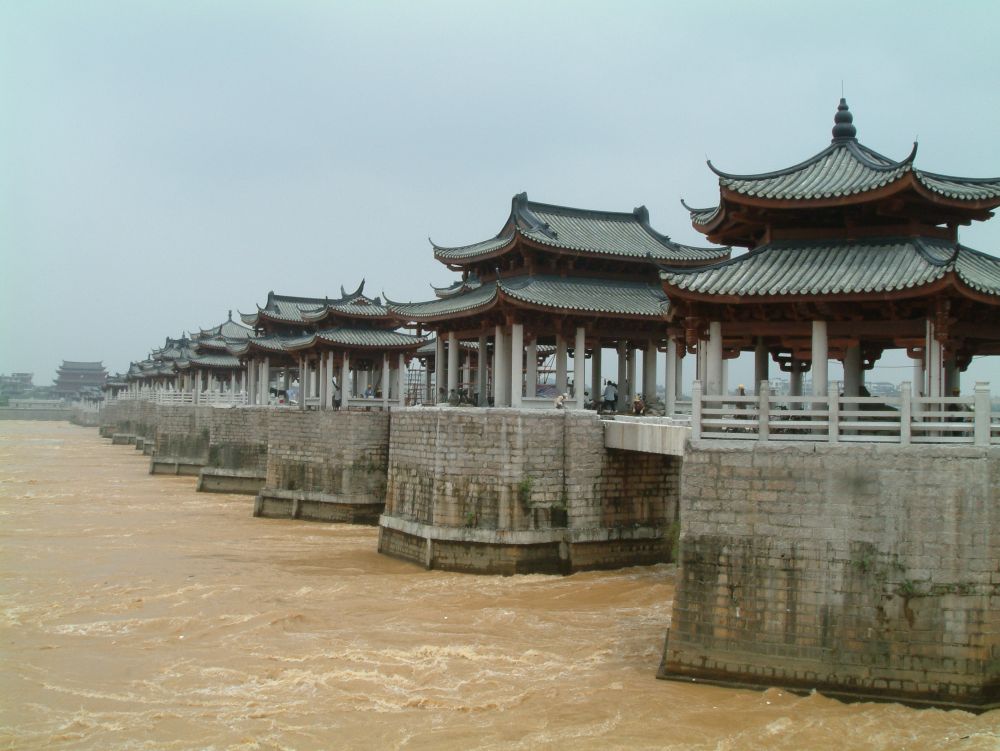 ↑?2007年重修中的廣濟(jì)橋和中段“十八梭船”啟閉式浮橋