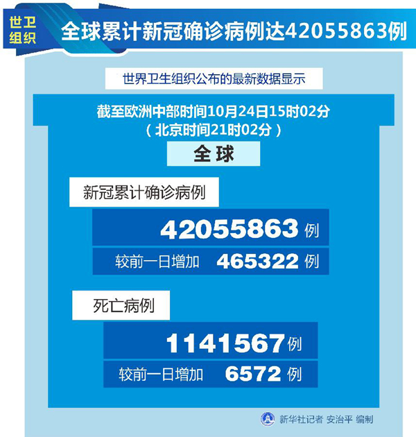 世衛組織網站最新數據顯示,截至歐洲中部時間24日15時02分(北京時間21時02分),全球確診病例較前一日增加465322例,達到42055863例;死亡病例增加6572例,達到1141567例。