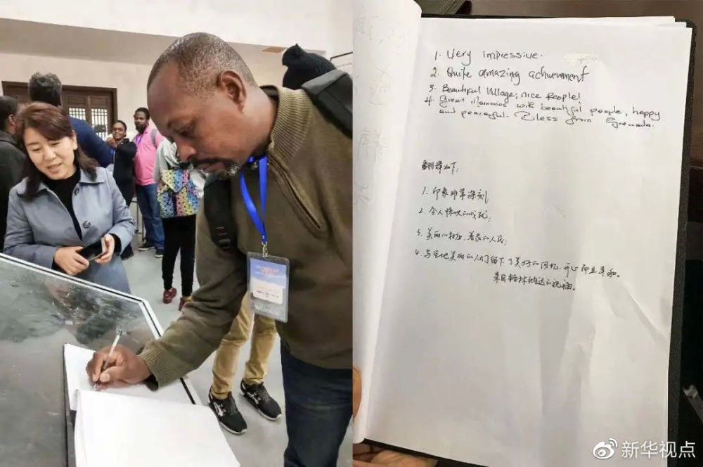 2019年10月28日,記者在十八洞村遇到了格林納達減貧戰略研修班的學員們,他們大多是來自格林納達農業部的官員。參觀完后,他們派出代表在十八洞村留言簿上寫下留言 新華社記者張玉潔 攝