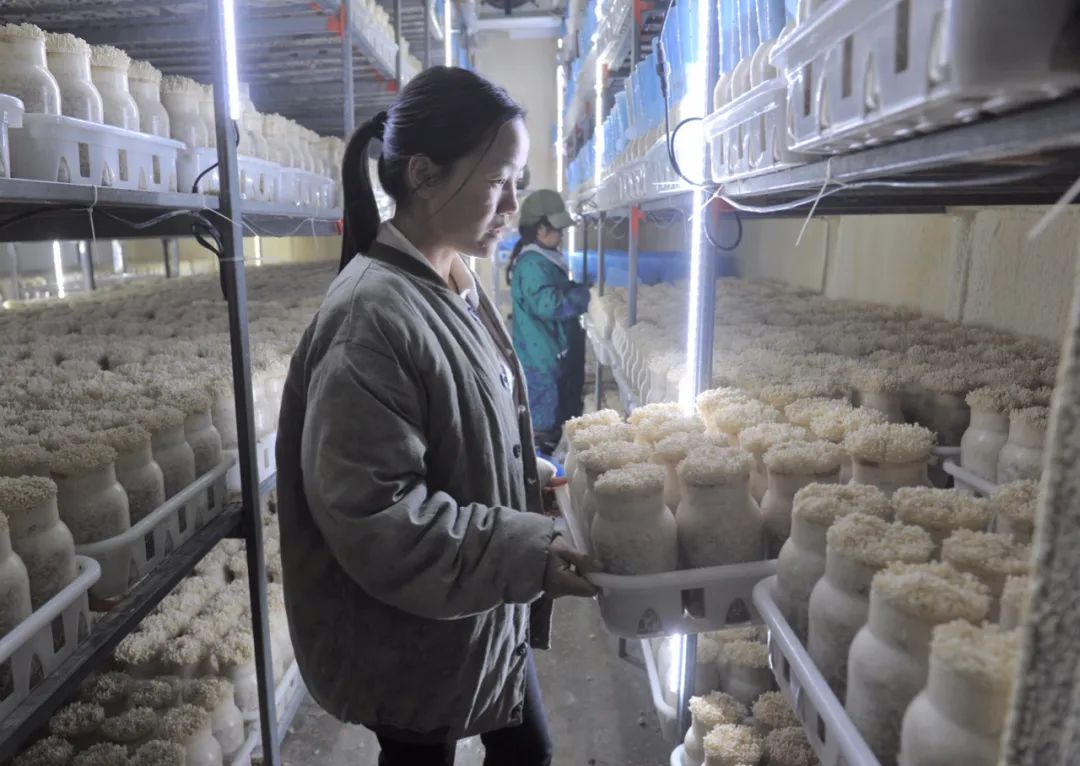 贛州市章貢區沙石鎮火燃村的貧困戶家庭成員,在扶貧車間低溫環境下從事蘑菇生產,實現就業脫貧 李傳材 攝