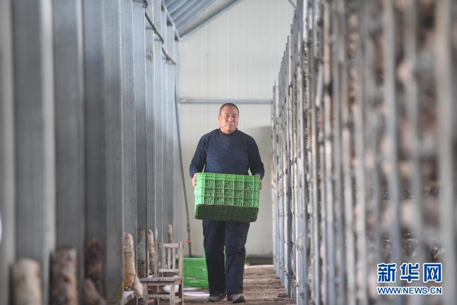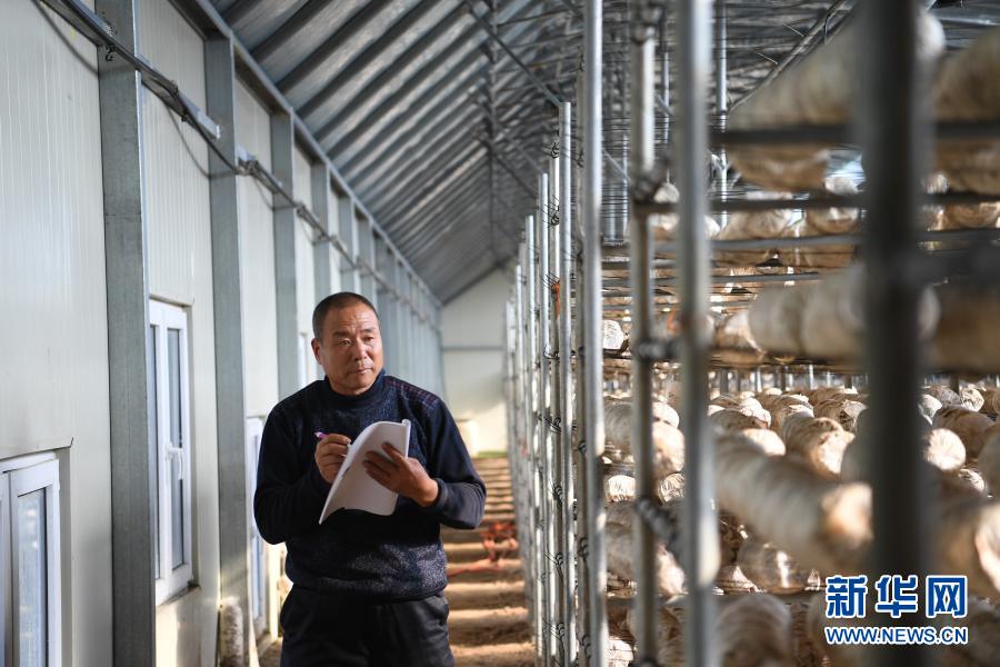河北省阜平縣黃連峪村脫貧戶杜玉明在北果園食用菌基地勞作(11月25日攝)。新華社記者 朱旭東 攝