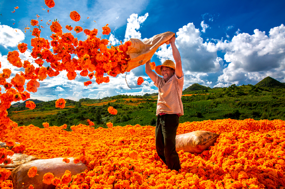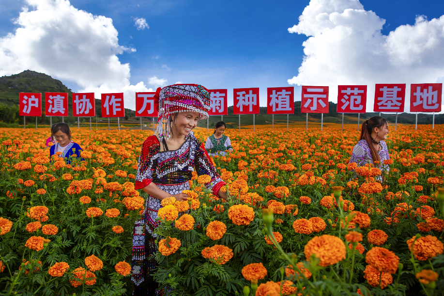 ????云南省文山壯族苗族自治州丘北縣萬壽菊種植示范基地受益百姓(組圖1) 沈玨 攝