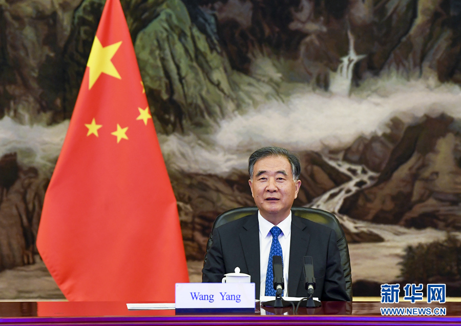12月16日,全國(guó)政協(xié)主席汪洋在北京以視頻方式會(huì)見巴基斯坦參議院主席桑吉拉尼。新華社記者 高潔 攝