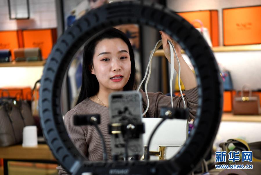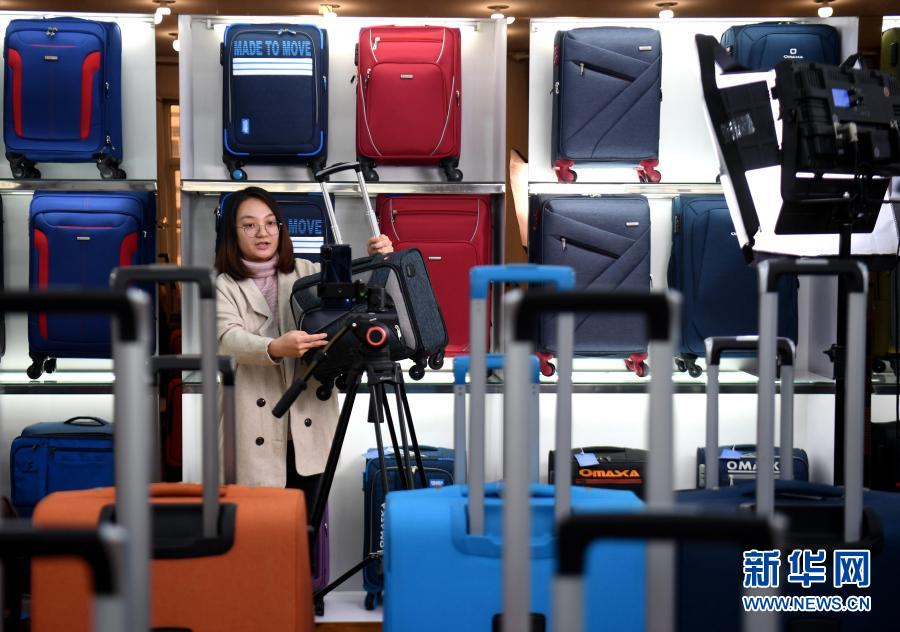 12月11日,河北保定白溝新城一家箱包生產企業的主播在進行產品推介和銷售。新華社記者 王曉 攝