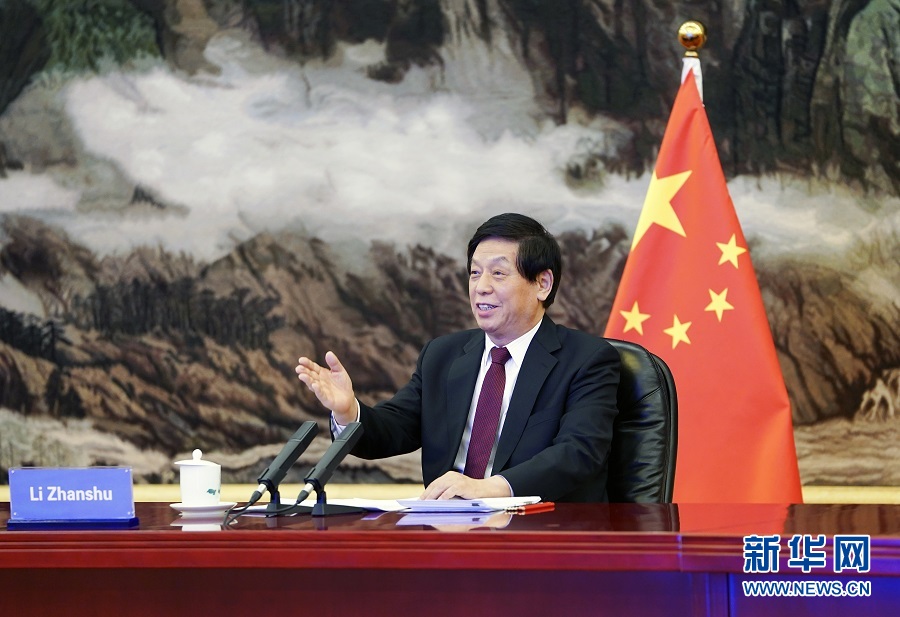 12月21日,全國人大常委會委員長栗戰書在北京人民大會堂以視頻方式同韓國國會議長樸炳錫舉行會談。新華社記者 張領 攝