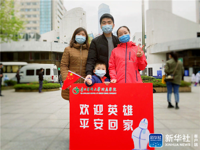↑貴州醫科大學附屬醫院護士葉青(右一)結束武漢抗疫工作后回到貴陽和家人合影留念(資料照片)。新華社發
