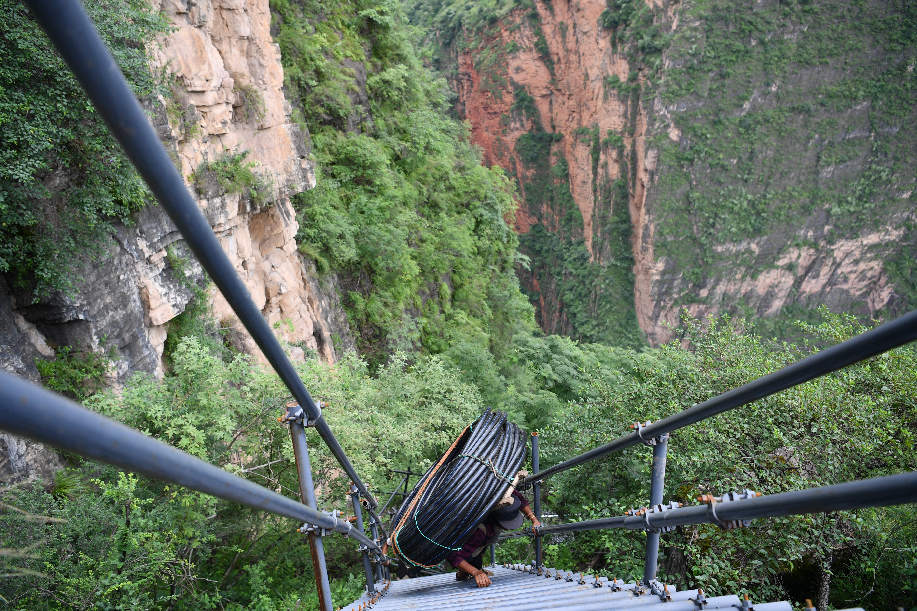 2017年9月初,四川涼山“懸崖村”村民背貨物通過天梯上山。四川省涼山州昭覺縣支爾莫鄉阿土列爾村,坐落于海拔約1600米的山坳中,從山底到山頂村莊海拔高差近1000米,村民往返村子都需要借助懸崖峭壁間的天梯,從而被稱為“懸崖村”。為緩解村民出行險的問題,當地投入120噸鋼材、共6000根鋼管修筑了2556級“鋼管天梯”,工程于2017年6月底徹底完工,如今,“鋼管天梯”已經取代了之前更危險的藤梯,成為村民通往外界唯一的道路。 張浪 攝