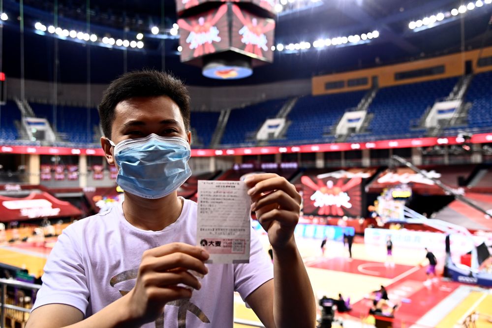 7月26日,在青島國信體育館,蘇柯帆展示著自己的紙質(zhì)球票。他成為CBA聯(lián)賽復(fù)賽允許觀眾現(xiàn)場觀賽后,首位進(jìn)場的觀眾。