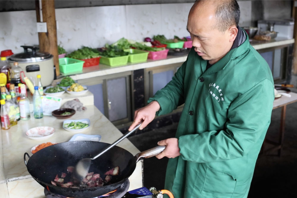 2月2日,在湖南省湘西土家族苗族自治州花垣縣十八洞村,楊正邦在炒臘肉。新華社記者 陳思汗 攝