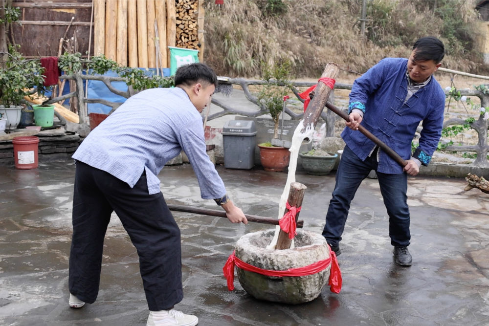 2月3日,在湖南省湘西土家族苗族自治州花垣縣十八洞村,村民在打糍粑,儲備過年物資。新華社記者 陳思汗 攝