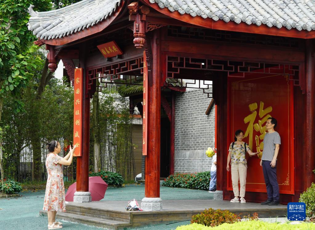 游客在成都市郫都區戰旗村拍照留念(8月8日攝)。新華社發(郭芯屹 攝)