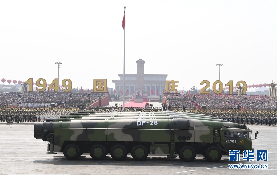 10月1日上午,慶祝中華人民共和國成立70周年大會在北京天安門廣場隆重舉行。這是東風-26核常兼備導彈方隊接受檢閱。 新華社記者 高潔 攝