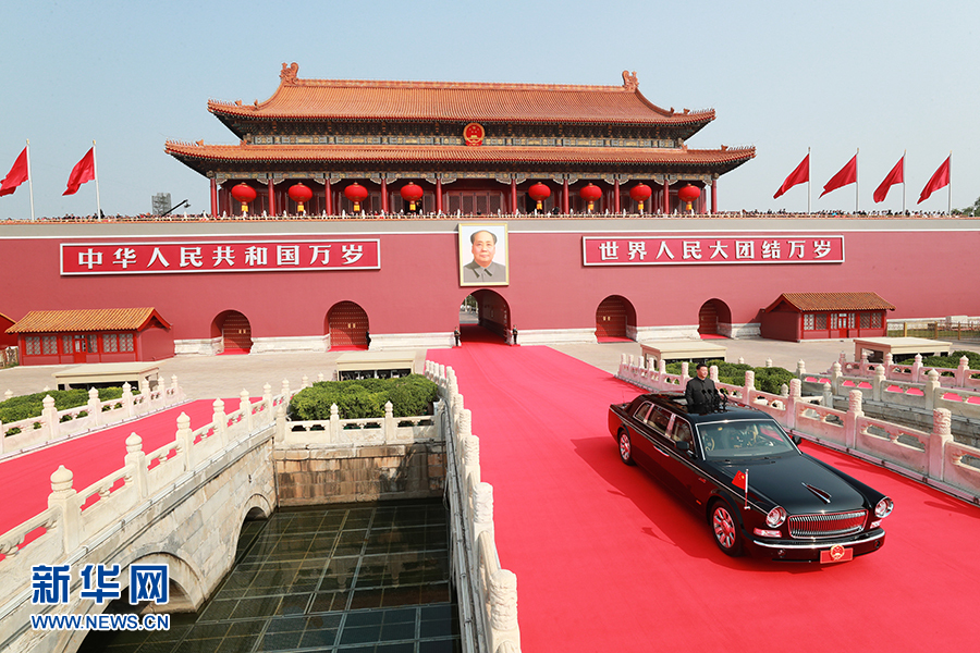 10月1日,慶祝中華人民共和國(guó)成立70周年大會(huì)在北京天安門廣場(chǎng)隆重舉行。中共中央總書記、國(guó)家主席、中央軍委主席習(xí)近平發(fā)表重要講話并檢閱受閱部隊(duì)。這是習(xí)近平乘坐檢閱車,經(jīng)過金水橋,駛上長(zhǎng)安街。 新華社記者 龐興雷 攝