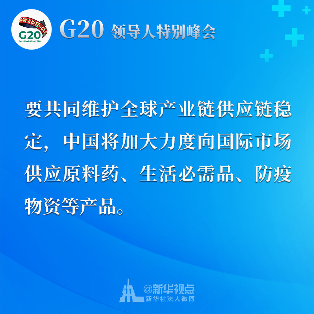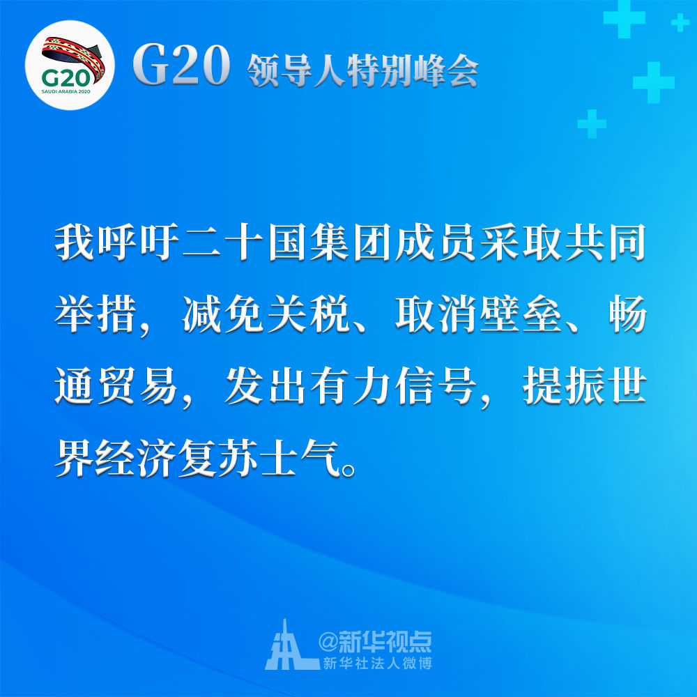 我呼吁二十國集團成員采取共同舉措,減免關稅、取消壁壘、暢通貿易,發出有力信號,提振世界經濟復蘇士氣。我們應該制定二十國集團行動計劃,并就抗疫宏觀政策協調及時作出必要的機制性溝通和安排。