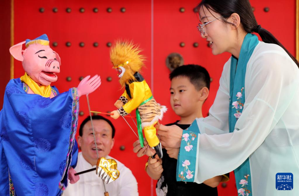 5月21日,在山东青岛,莱西木偶艺术团的演员给小朋友演示木偶戏表演技巧。