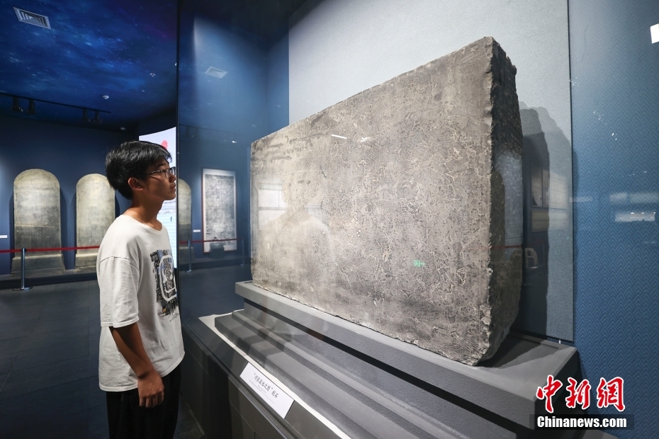 7月18日,山西运城,市民在参观明代万历年间的“河东盐池之图”刻石。河东池盐博物馆通过介绍盐池形成、盐业发展变迁等内容,集中展示盐文化发展历程。中新社记者 张云 摄